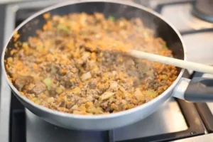 - Voeg het gehakt en de kruiden toe en bak het gehakt rul.