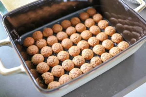 - Doe een beetje chocolademelk in een kommetje. Doop de kruidnoten kort in de chocolademelk en leg ze daarna in de schaal.